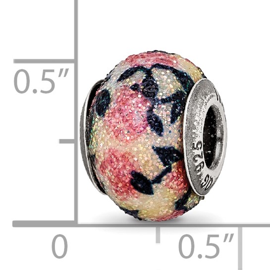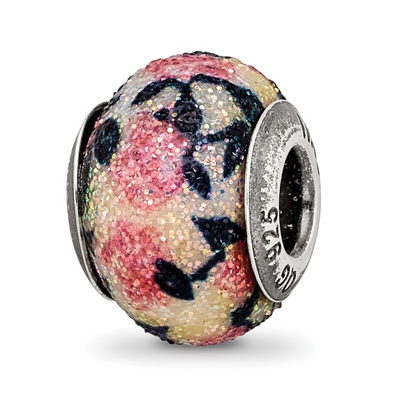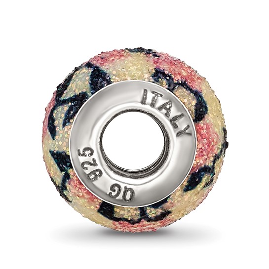 Pink floral overlay bead is made of sterling silver. This bead fits all major modular bracelet brands. Color range varies. Made in Italy. Ships from USA.
