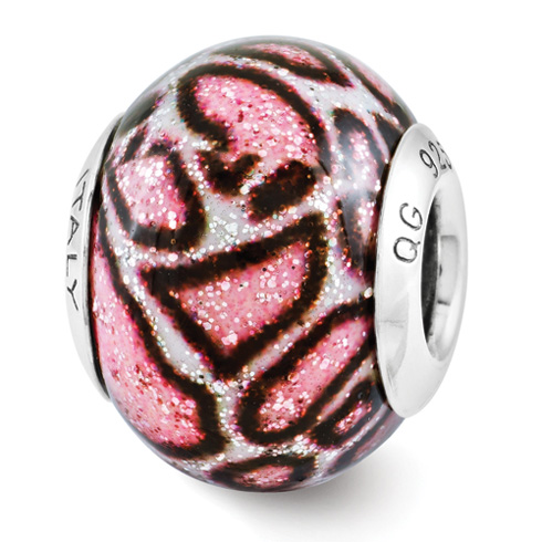 Pink print overlay bead is made of sterling silver. This bead fits all major modular bracelet brands. Color range varies. Made in Italy.