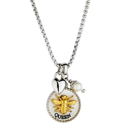 Necklace features a sterling silver queen bee pendant, puffed heart pendant and one white 4mm cultured pearl. Queen bee pendant dimensions: 20mm x 15mm. Box chain width: 1.5mm, length: 18in. This necklace is part of the Ones We Love collection.