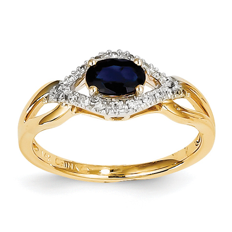 This blue sapphire and diamond ring is made of polished, 14kt yellow gold. Bypass shank design. Gemstone details: one 2/3 ct tw genuine oval blue sapphire and 1/10 ct tw diamond accents. Approximate item weight: 2.5 grams. Imported.