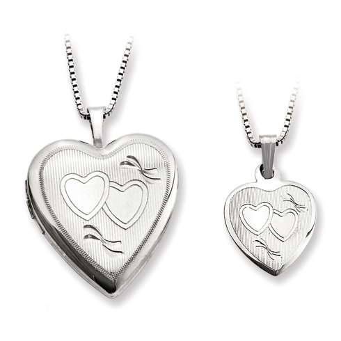 This textured matching set of heart shaped lockets is designed for mother and daughter. Mother's locket is 20mm, slightly larger than a penny. Each locket has a textured front with diamond-cut heart design and a satin finish back. Box chain length: 20in for mother, 14in for daughter. Spring ring clasp. Holds two photos. Import.