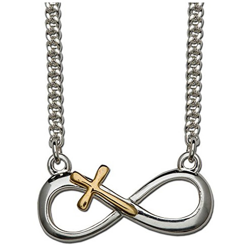 This stering silver infinity necklace has a gold-plated cross. The pendant dangles from an 18in sterling silver plated lightweight curb chain. Pendant size: 3/4in x 3/8in. Deluxe gift boxed.