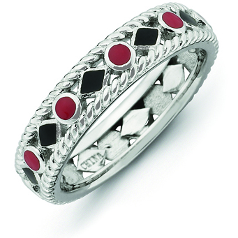 Sterling silver stackable ring has enameled black and red accents all the way around the ring. Metal weight: 3.5 grams. Available in whole finger sizes only, 5-10. Imported. Part of the Stackable Expressions collection.