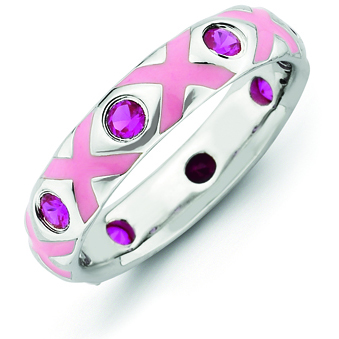 Sterling silver stackable ring has created rubies and pink enamel x's all the way around the ring. Approximate gemstone total weight: 0.7 carats. Metal weight: 3.22 grams. Available in whole finger sizes only, 5-10. Imported. Part of the Stackable Expressions collection.