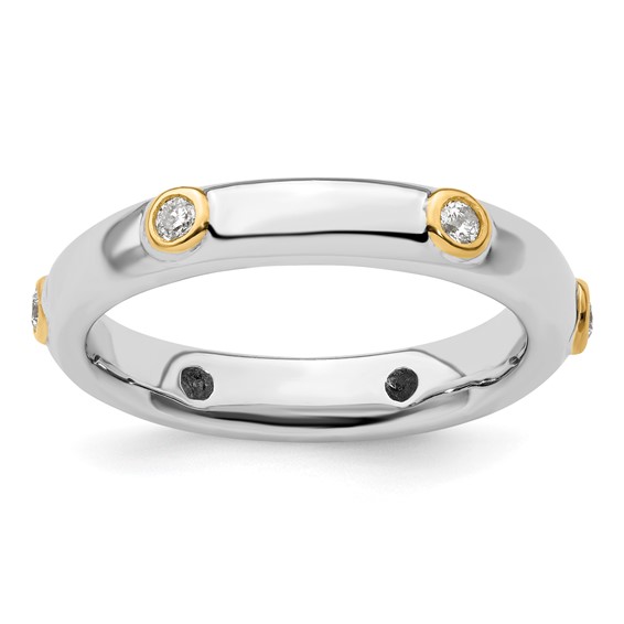 Polished sterling silver stackable ring features six diamonds in 14kt yellow gold bezels. Approximate diamond total weight: 0.122 carats. Ring width: 3.25mm. Metal weight: 4.65 grams. Available in whole finger sizes only, 5-10. Imported. Part of the Stackable Expressions collection.