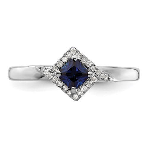 Sterling silver stackable created sapphire ring has diamond accents. Approximate diamond total weight: 0.1 carats. Metal weight: 3.74 grams. Available in whole finger sizes only, 5-10. Imported. Part of the Stackable Expressions collection.