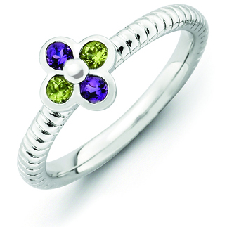 Amethyst and peridot flower ring is made of polished sterling silver. Ring width: 2.25mm. Metal weight: 3.2 grams. Available in whole finger sizes only, 5-10. Import. Part of the Stackable Expressions collection.