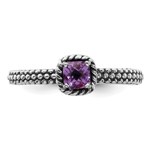 Checkerboard cut amethyst ring is made of polished sterling silver with a beaded texture. Ring width: 2.5mm. Metal weight: 2.7 grams. Available in whole finger sizes only, 5-10. Imported. Part of the Stackable Expressions collection.