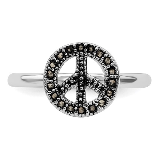 Peace symbol ring is adorned with marcasite and made of polished sterling silver. Metal weight: 3.5 grams. Available in whole finger sizes only, 5-10. Imported. Part of the Stackable Expressions collection.