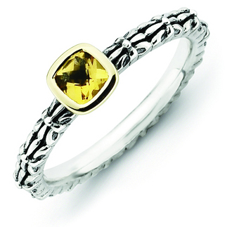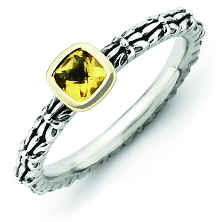 1/5 ct checkerboard cut citrine ring is made of antiqued sterling silver with 14kt yellow gold bezel. Width: 2.5mm. Metal weight: 3.25 grams. Available in whole finger sizes only, 5-10. Imported. Part of the Stackable Expressions collection.
