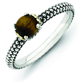 Sterling silver stackable ring has a round cabochon cut tiger's eye stone. Antiqued beaded texture with 14kt yellow gold accents. Metal weight: 2.79 grams. Available in whole finger sizes only, 5-10. Imported. Part of the Stackable Expressions collection.
