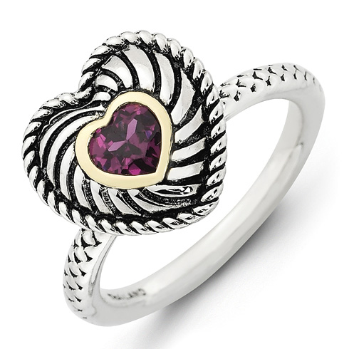 Polished sterling silver stackable ring has a heart shaped rhodolite garnet set within a 14kt yellow gold bezel. Metal weight: 5.4 grams. Available in whole finger sizes only, 5-10. Imported. Part of the Stackable Expressions collection.