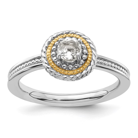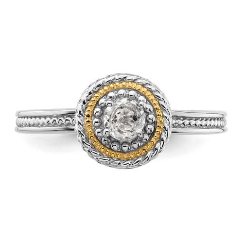 Sterling silver stackable ring has a genuine .28 ct round white topaz stone with 14kt yellow gold accents. Beaded texture. White topaz diameter: 4mm. Ring width: 2.25mm. Metal weight: 3.65 grams. Available in whole finger sizes only, 5-10. Imported. Part of the Stackable Expressions collection.