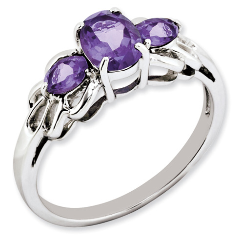Polished sterling silver ring features three purple amethyst oval stones. Amethyst ct weight: 1.59. Weight: 2.01 grams. 7mm x 5mm oval center stone. Available in whole sizes 5-10 only. Imported.