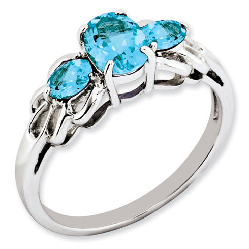 Three stone light swiss blue topaz ring is made of polished sterling silver. Blue Topaz ct weight: 2.1. Weight: 2.01 grams. 7mm x 5mm oval center stone. Available in whole sizes 5-10 only. Imported.