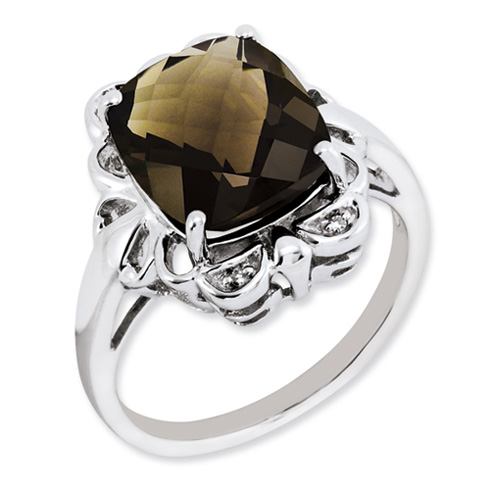 5.45 carat checkerboard cut smoky quartz ring is made of polished sterling silver. Diamond accents carat total weight: 0.02. 12mm x 10mm cushion checkerboard stone. Available in whole sizes 5-10 only. Weight: 3.95 grams. Imported.