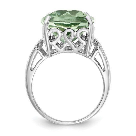 Green quartz and diamond ring is made of polished sterling silver. Gemstone ct weight: 14.1. 18mm x 13mm cushion cut stone. Diamond ct weight: 0.02. Available in whole sizes 5-10 only. Imported. Weight: 3.5 grams.