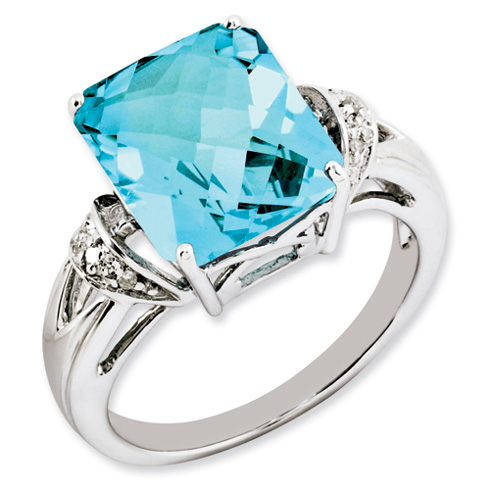 Sterling silver octagonal blue topaz ring has diamond accents. Blue topaz carat weight: 7.5. Diamond ct weight: 0.03. Available in whole sizes 5-10 only. Weight: 3.15 grams. Imported.