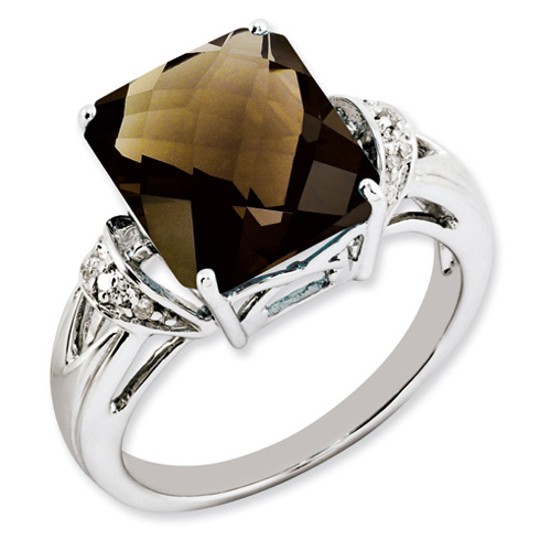 Polished sterling silver ring has a large checkerboard smoky quartz with diamond accents. Smoky quartz ct weight: 5.45. Diamond ct weight: 0.03. Weight: 3.15 grams. 12mm x 10mm octagonal checkerboard stone. Available in whole sizes 5-10 only. Imported.
