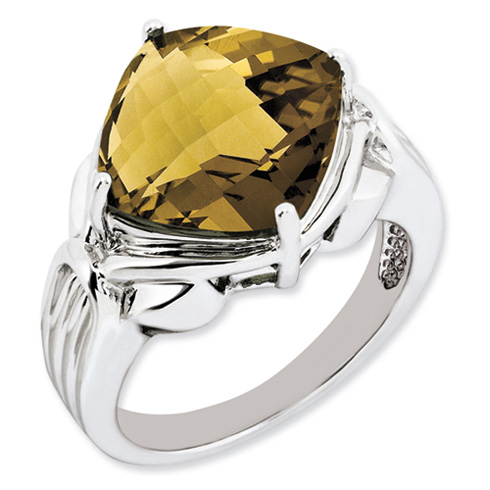 Polished sterling silver has a 7.4 ct whiskey quartz cushion checkerboard gemstone. Stone size: 12mm x 12mm. Weight: 5.9 grams. Available in whole sizes 5-10 only. Import.