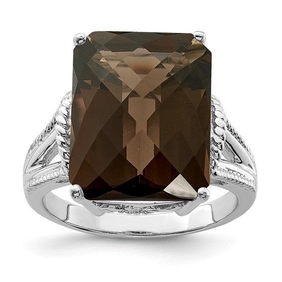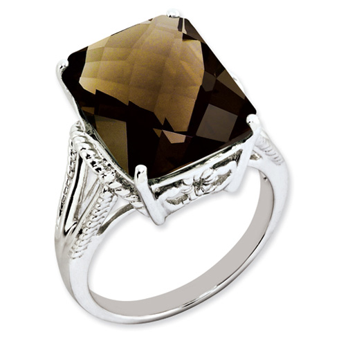 Polished sterling silver ring features a 10.75 ct checkerboard smokey quartz gemstone. Stone dimensions: 16mm x 12mm. Weight: 3.76 grams. Available in whole sizes 5-10 only. Import.