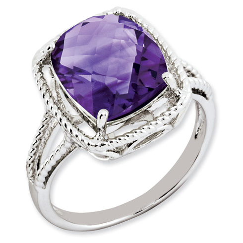 5.45 carat amethyst ring has a rope textured frame crafted in polished sterling silver. 12mm x 10mm cushion checkerboard center stone. Available in whole sizes 5-10 only. Weight: 2.9 grams. Imported.