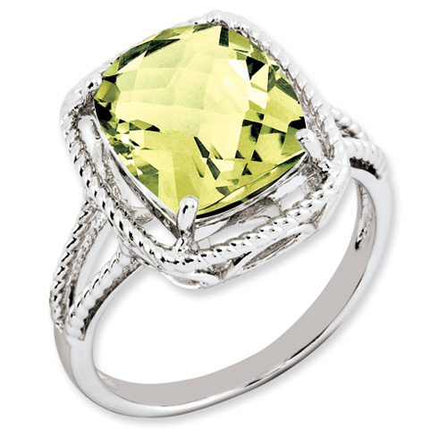 Cushion cut lemon quartz ring is made of polished sterling silver. Lemon quartz ct weight: 5.45. Weight: 2.9 grams. 12mm x 10mm cushion checkerboard stone. Available in whole sizes 5-10 only. Imported.