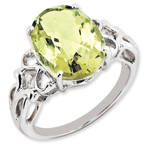 Polished sterling silver lemon quartz ring has a cut-out shank. Oval lemon quartz carat weight: 5.4. 14mm x 10mm oval checkerboard stone. Available in whole sizes 5-10 only. Imported. Weight: 3.4 grams.