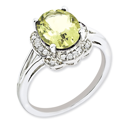 2.4 carat oval lemon quartz an diamond ring is made of polished sterling silver. 10mm x 8mm oval lemon quartz center stone. Diamond ct weight: 0.09. Weight: 2.93 grams. Available in whole sizes 5-10 only. Imported.