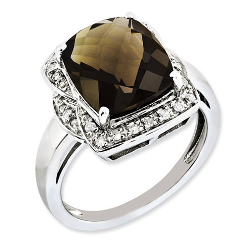 Sterling silver cushion checkerboard smoky quartz ring has diamond accents. Smoky quartz ct weight: 5.45. Diamond ct weight: 0.15. Weight: 4.86 grams. 12mm x 10mm cushion checkerboard stone. Available in whole sizes 5-10 only. Imported.