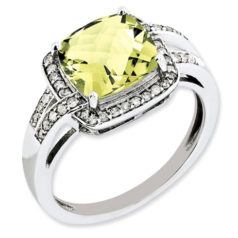 Sterling silver 3.2 ct lemon quartz ring has diamond accents. Diamond ct weight: 0.2. Weight: 3.67 grams. 9mm x 9mm cushion checkerboard stone. Available in whole sizes 5-10 only. Imported.
