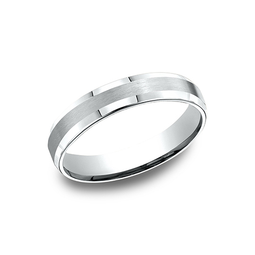 Solid 14k white gold 4mm wedding band is made of satin finish with polished beveled edges. Die struck and comfort fit. Made in USA.