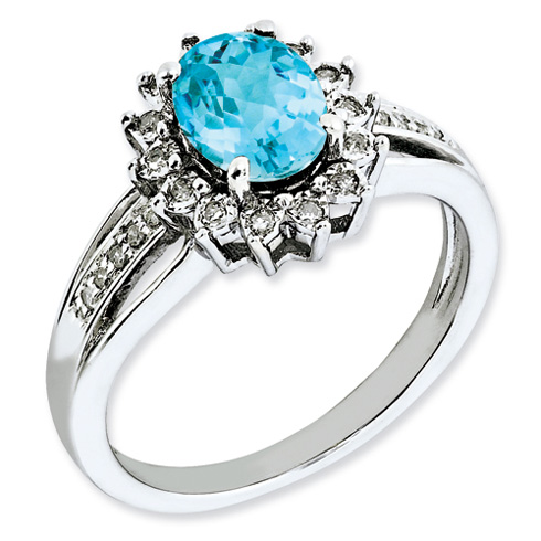 Polished sterling silver ring has a 1.35 ct oval light swiss blue topaz surrounded by diamonds. Diamond ct weight: 0.11. Weight: 3.63 grams. Light swiss blue topaz size: 8mm x 6mm. Available in whole sizes 5-10 only. Imported.