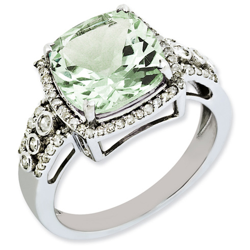 Polished sterling silver. Green Amethyst ct weight: 4.25. Diamond ct weight: 0.252. Weight: 3.03 grams. 10mm x 10mm cushion checkerboard center stone. Available in whole sizes 5-10 only. Imported.