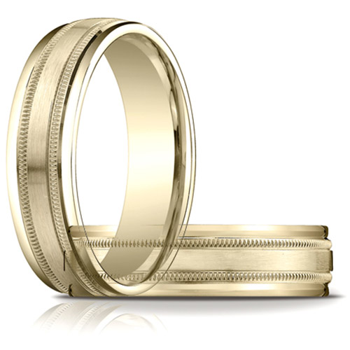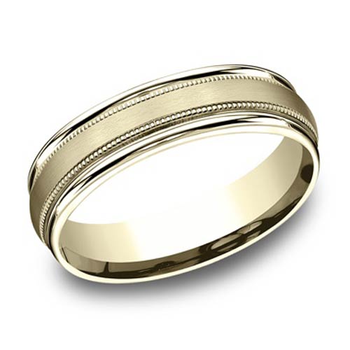 This men's solid 14k yellow gold wedding band has a satin flat center with milgrain and polished rounded edges. Die struck and comfort fit. Width: 6mm. Made in USA.