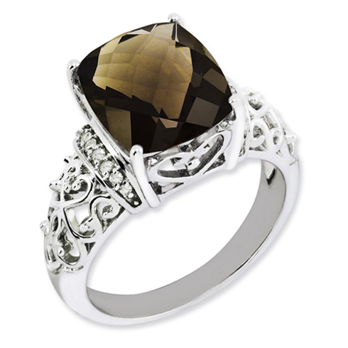 Sterling silver 5.45 carat smoky quartz ring has diamond accents and a fancy shank. Diamond ct weight: 0.08. 12mm x 10mm cushion checkerboard stone. Available in whole sizes 5-10 only. Weight: 2.5 grams. Imported.