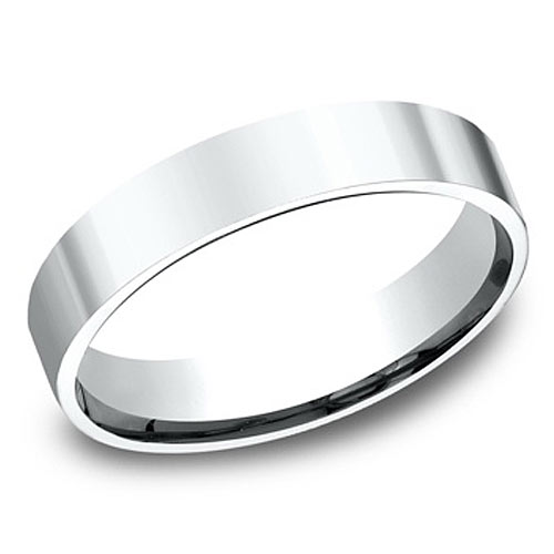 This elegant flat 4mm wedding band is made of solid 14k white gold. Die struck and comfort fit. Flat center, polished finish. Thickness: 1.8mm. Made in USA.