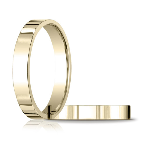 14k yellow gold flat wedding band is die struck and comfort fit. Polished finish. Width: 4mm. Solid 14k yellow gold. Made in USA.
