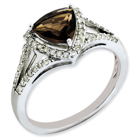 Polished sterling silver. Smokey Quartz ct weight: 1.02. Diamond ct weight: 0.25. Weight: 2.25 grams. 7mm x 7mm trillion stone. Available in whole sizes 5-10 only. Imported.