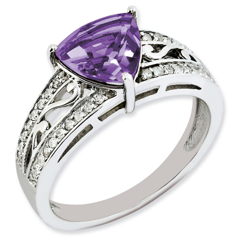 Sterling silver 1.56 carat trillion cut amethyst ring has diamond accents. Diamond ct weight: 0.18. 8mm x 8mm trillion center stone. Available in whole sizes 5-10 only. Weight: 3.25 grams. Imported.