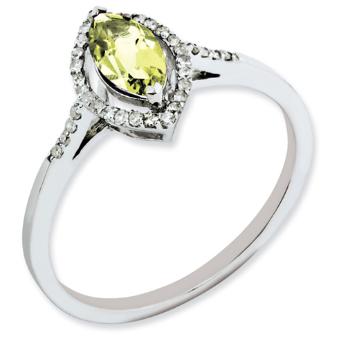 Polished sterling silver. Lemon Quartz ct weight: 0.5. Diamond ct weight: 0.102. Weight: 3 grams. 8mm x 4mm marquise. Available in whole sizes 5-10 only. Imported.