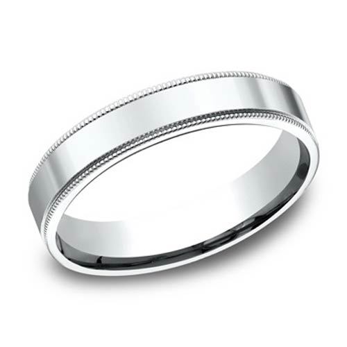 Solid 14k white gold 4mm wedding band is die struck and comfort fit. Flat center, milgrain edges and polished finish. Thickness: 1.8mm. Made in USA.
