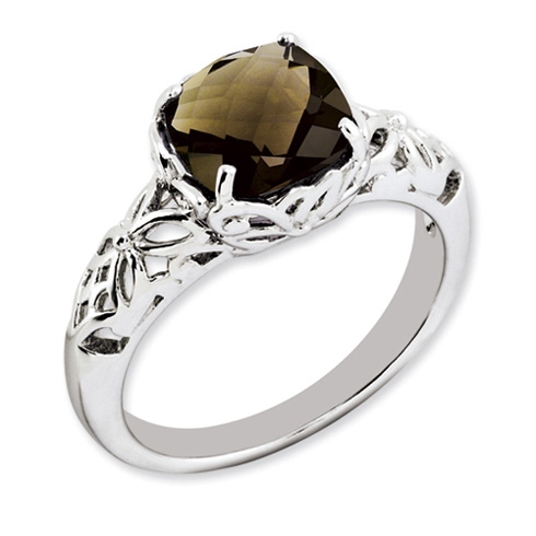 Sterling silver 2.25 ct smoky quartz ring has floral design. 8mm x 8mm cushion checkerboard stone. Available in whole sizes 5-10 only. Weight: 3.5 grams. Imported.