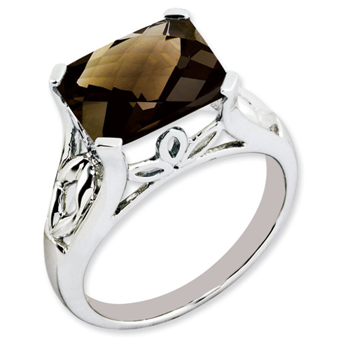 Sterling silver 4.0 carat smoky quartz ring has floral accents in the gallery. 11mm x 9mm octagonal checkerboard stone. Available in size 7 only. Weight: 3 grams. Imported.