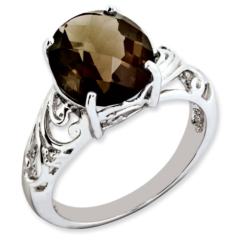 Polished sterling silver. Smoky Quartz ct weight: 4.55. Diamond ct weight: 0.01. Weight: 2.9 grams. 12mm x 10mm oval checkerboard stone. Available in whole sizes 5-10 only. Imported.