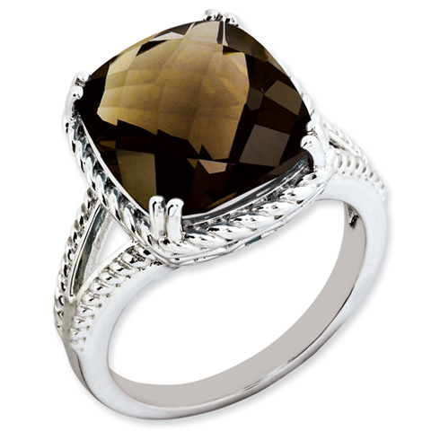 Sterling silver 7 carat cushion cut smoky quartz ring has a rope texture. 14mm x 12mm checkerboard center stone. Available in whole sizes 5-10 only. Weight: 4.6 grams. Imported.