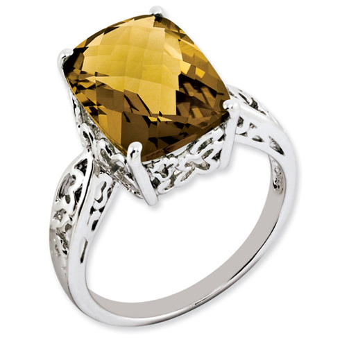 Checkerboard whiskey quartz ring is made of polished sterling silver. Gemstone ct weight: 6.55. Weight: 3.02 grams. Available in whole sizes 5-10 only. Imported.