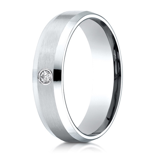 This men's 14kt white gold beveled wedding band features a single diamond accent. 1 x .08CT round brilliant diamond. Diamond color G, clarity SI1. Satin center with polished edges. Width: 6mm. Die struck and heavy comfort fit. Made in USA.