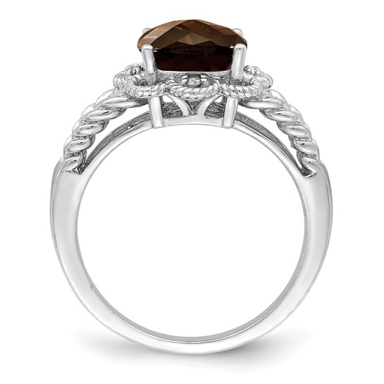 Sterling silver 2.25 carat square cushion cut smoky quartz ring has .04 carat total weight diamond accents and a woven shank. 8mm x 8mm cushion cut stone. Available in whole sizes 5-10 only. Weight: 3.4 grams. Imported.