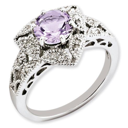 Sterling silver 1.25 carat pink quartz ring has a triangular top with diamond accents. Diamond ct weight: 0.08. 7mm round pink quartz center stone. Weight: 3.75 grams. Import.